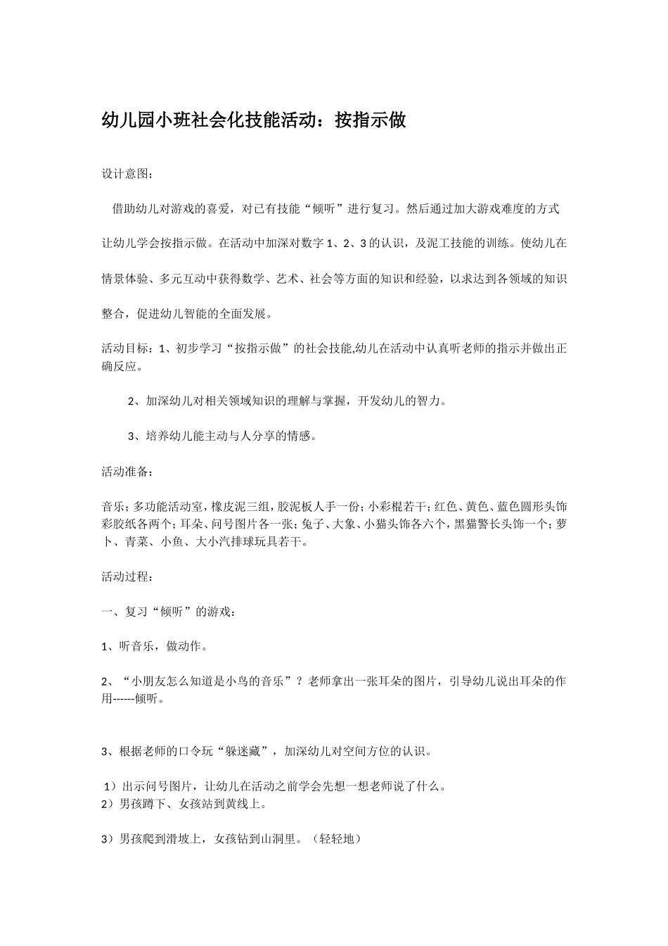 幼儿园小班社会化技能活动:按指示做设计意图:借助幼儿对游戏的喜爱,对已有技能“倾听”进行复习。然后通过加大游戏难度的方式让幼儿学会按指示做。在活动中加深对数字1、2、3的认识,及泥工技能的训练。使幼儿...