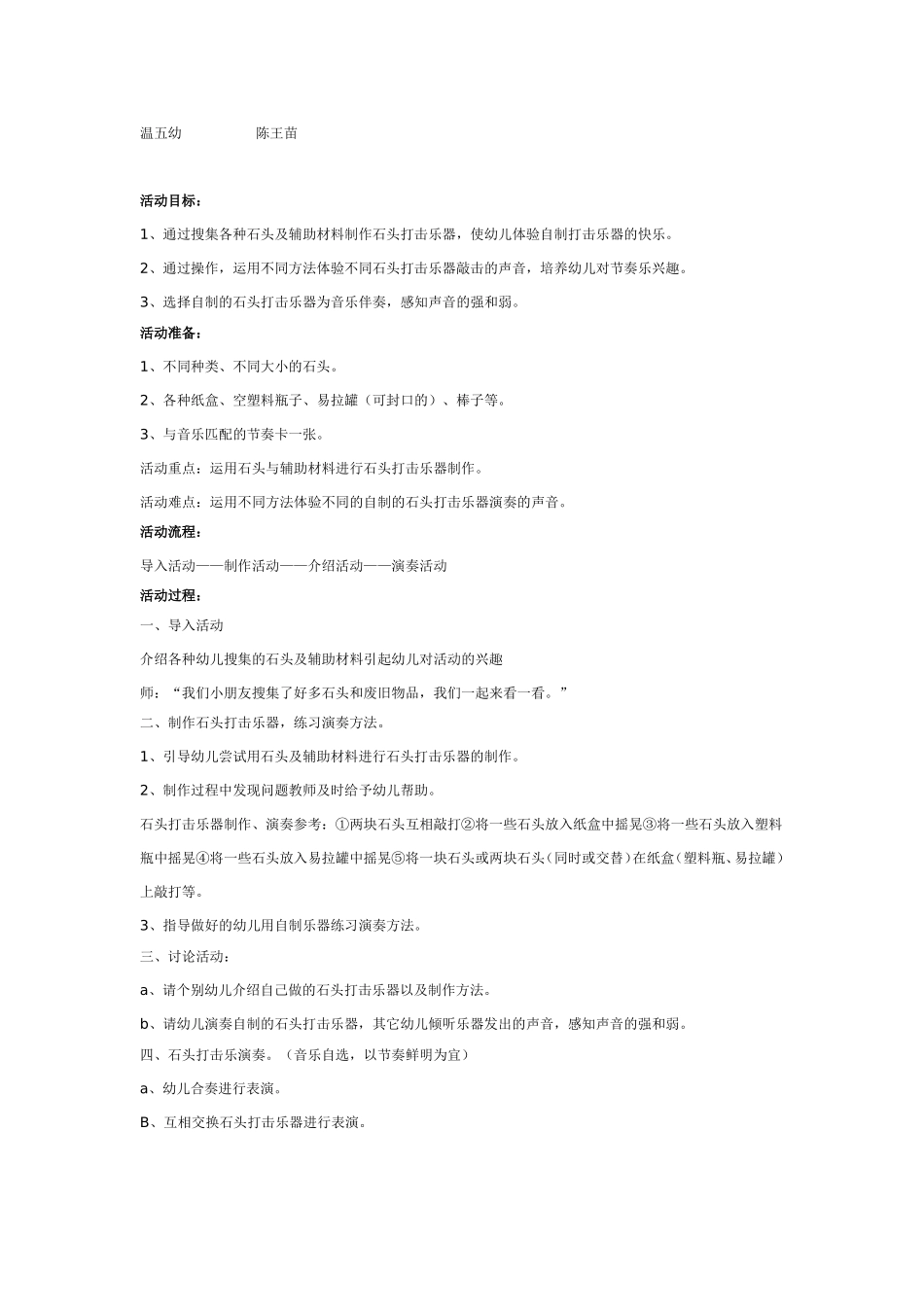 温五幼陈王苗活动目标:1、通过搜集各种石头及辅助材料制作石头打击乐器,使幼儿体验自制打击乐器的快乐。2、通过操作,运用不同方法体验不同石头打击乐器敲击的声音,培养幼儿对节奏乐兴趣。3、选择自制的石头打...