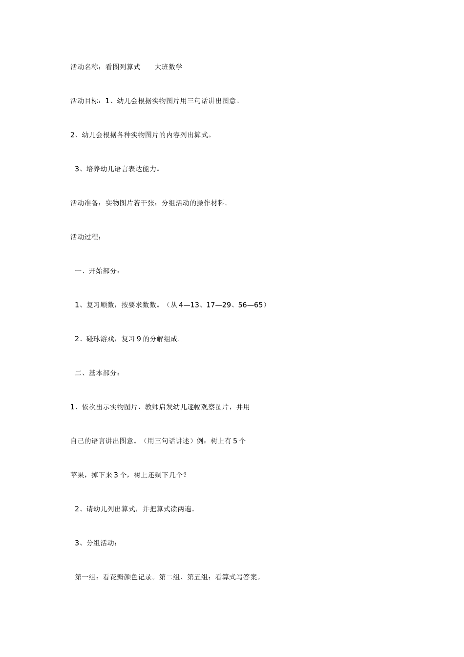 活动名称:看图列算式大班数学活动目标:1、幼儿会根据实物图片用三句话讲出图意。2、幼儿会根据各种实物图片的内容列出算式。3、培养幼儿语言表达能力。活动准备:实物图片若干张;分组活动的操作材料。活动过程...