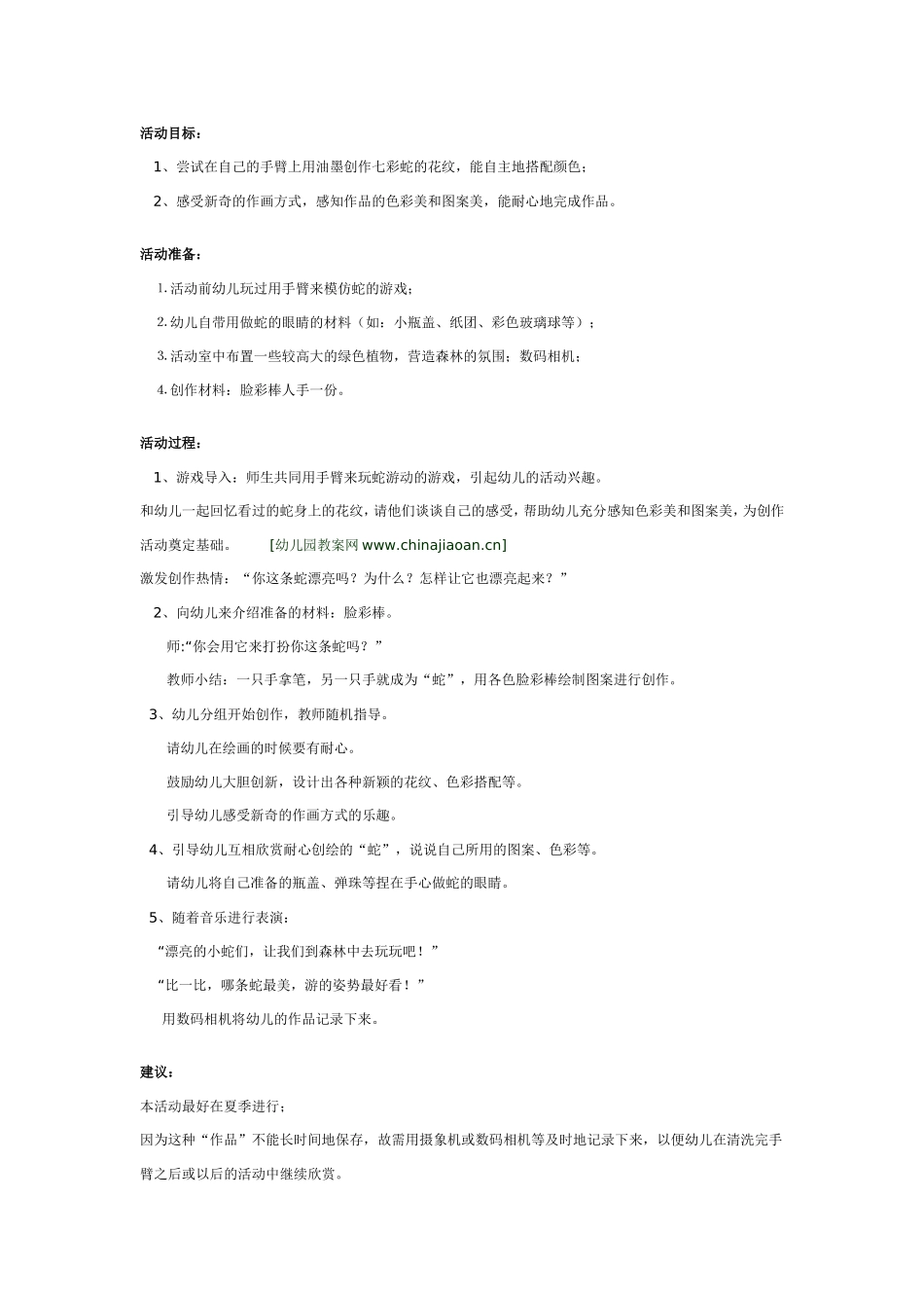 活动目标:1、尝试在自己的手臂上用油墨创作七彩蛇的花纹,能自主地搭配颜色;2、感受新奇的作画方式,感知作品的色彩美和图案美,能耐心地完成作品。活动准备:⒈活动前幼儿玩过用手臂来模仿蛇的游戏;⒉幼儿自...