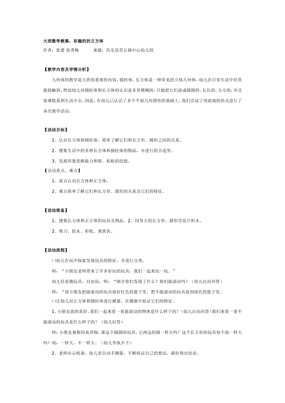 大班数学教案:有趣的的立方体作者:张蕾张秀梅来源:昌乐县营丘镇中心幼儿园【教学内容及学情分析】几何体的教学是大班很重要的内容,圆柱体、长方体是一种常见的立体几何体,幼儿在日常生活中经常能接触到,然...