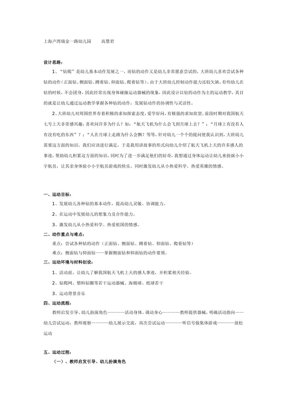 上海卢湾瑞金一路幼儿园高慧君设计思路:1、“钻爬”是幼儿基本动作发展之一,而钻的动作又是幼儿非常愿意尝试的,大班幼儿喜欢尝试各种钻的动作(正面钻、侧面钻、蹲着钻、仰面钻、爬着钻等),由于大班幼儿控制...