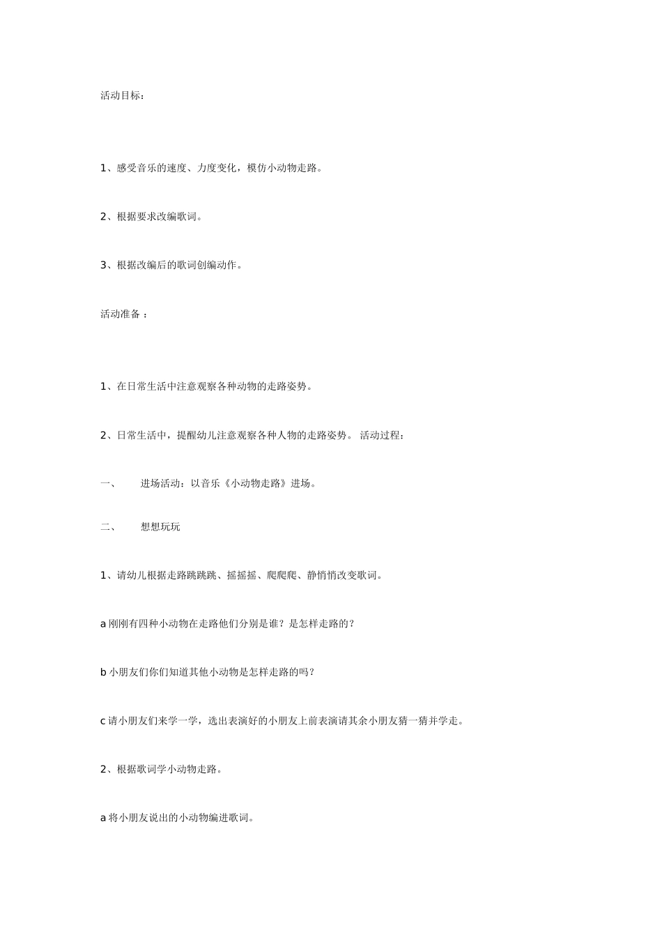 活动目标:1、感受音乐的速度、力度变化,模仿小动物走路。2、根据要求改编歌词。3、根据改编后的歌词创编动作。活动准备:1、在日常生活中注意观察各种动物的走路姿势。2、日常生活中,提醒幼儿注意观察各种人物...