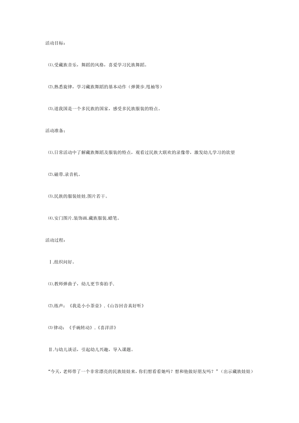 活动目标:⑴.受藏族音乐,舞蹈的风格,喜爱学习民族舞蹈。⑵.熟悉旋律,学习藏族舞蹈的基本动作(弹簧步.甩袖等)⑶.道我国是一个多民族的国家,感受多民族服装的特点。活动准备;⑴.日常活动中了解藏族舞蹈及服...