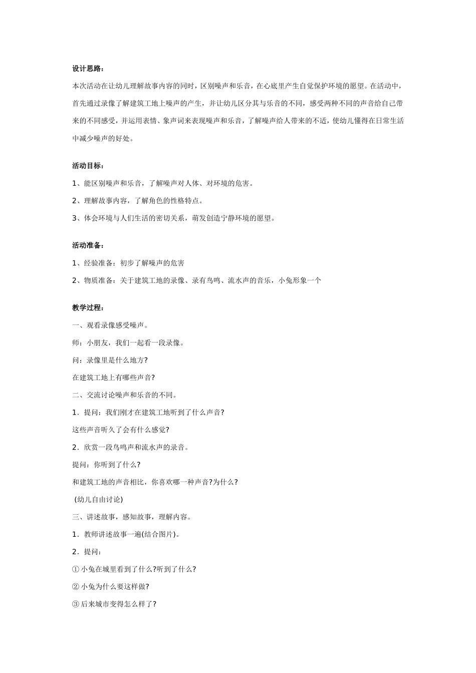 设计思路:本次活动在让幼儿理解故事内容的同时,区别噪声和乐音,在心底里产生自觉保护环境的愿望。在活动中,首先通过录像了解建筑工地上噪声的产生,并让幼儿区分其与乐音的不同,感受两种不同的声音给自己带...