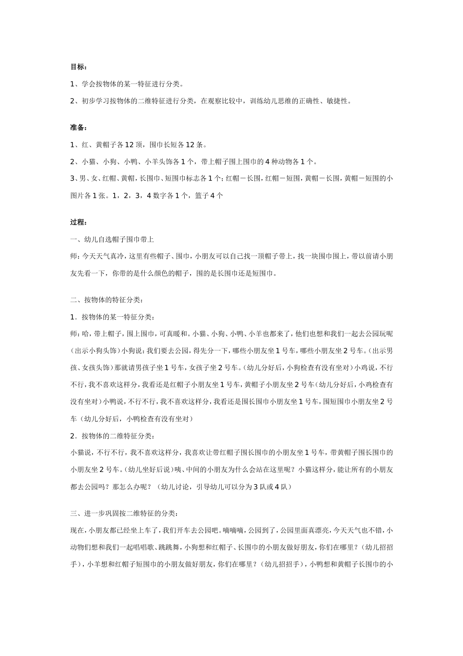 目标:1、学会按物体的某一特征进行分类。2、初步学习按物体的二维特征进行分类,在观察比较中,训练幼儿思维的正确性、敏捷性。准备:1、红、黄帽子各12顶,围巾长短各12条。2、小猫、小狗、小鸭、小羊头饰各1个...