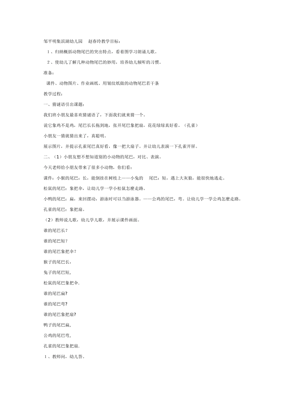 邹平明集滨湖幼儿园赵春玲教学目标:1、归纳概括动物尾巴的突出特点,看着图学习朗诵儿歌。2、使幼儿了解几种动物尾巴的妙用,培养幼儿倾听的习惯。准备:课件、动物图片、作业画纸、用皱纹纸做的动物尾巴若干...