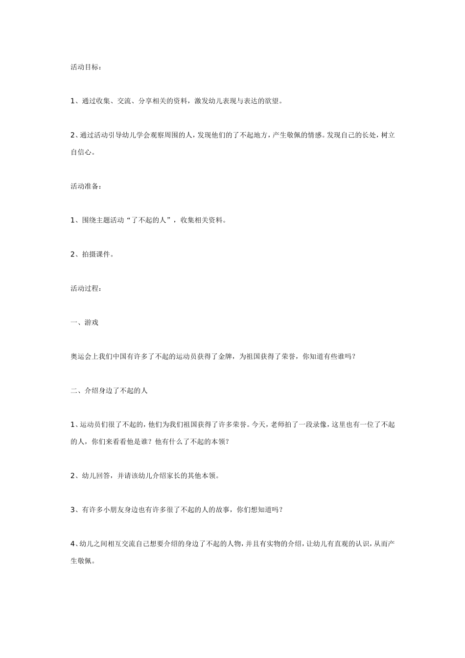 活动目标:1、通过收集、交流、分享相关的资料,激发幼儿表现与表达的欲望。2、通过活动引导幼儿学会观察周围的人,发现他们的了不起地方,产生敬佩的情感。发现自己的长处,树立自信心。活动准备:1、围绕主题活...