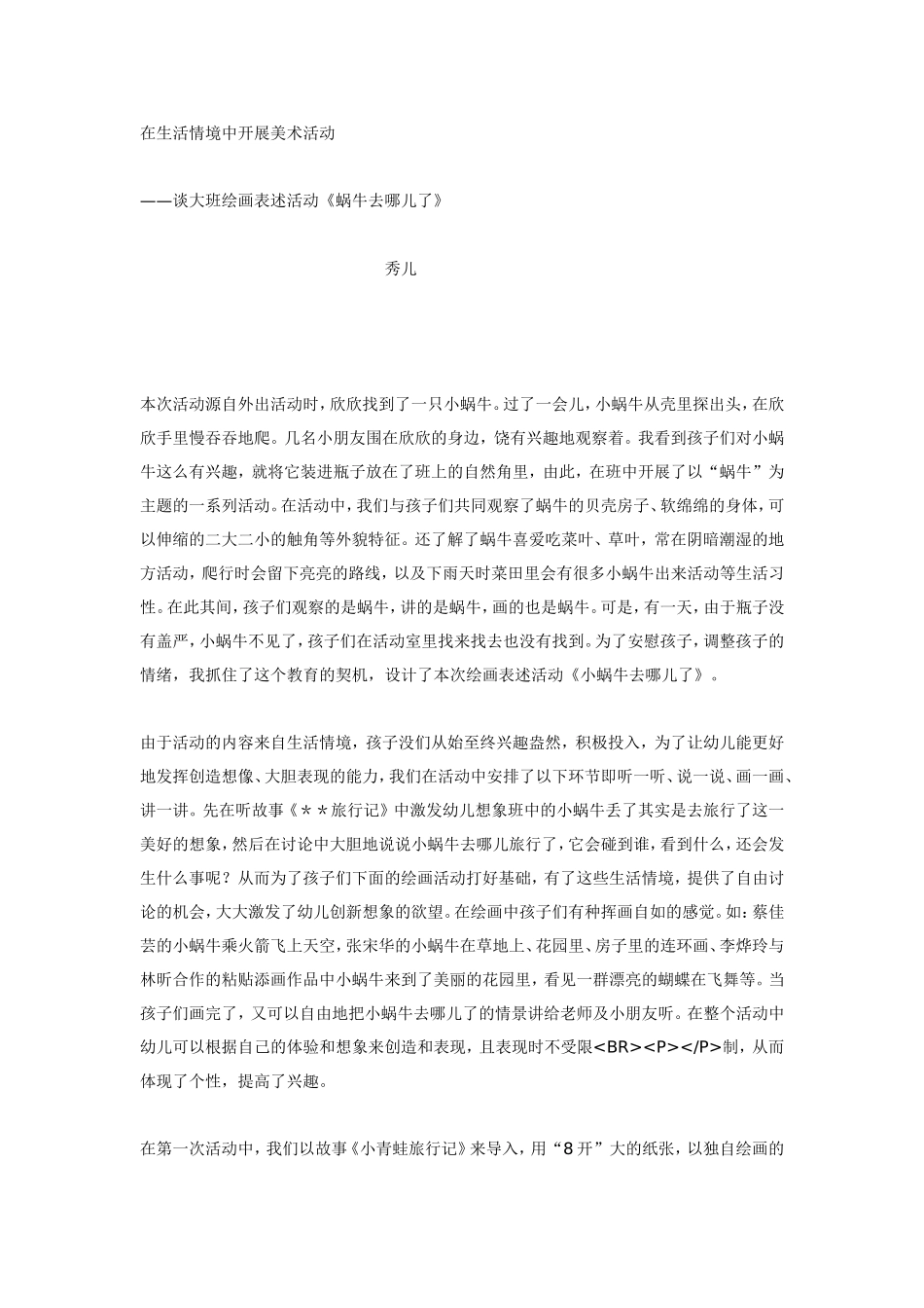 在生活情境中开展美术活动——谈大班绘画表述活动《蜗牛去哪儿了》秀儿本次活动源自外出活动时,欣欣找到了一只小蜗牛。过了一会儿,小蜗牛从壳里探出头,在欣欣手里慢吞吞地爬。几名小朋友围在欣欣的身边,饶有...