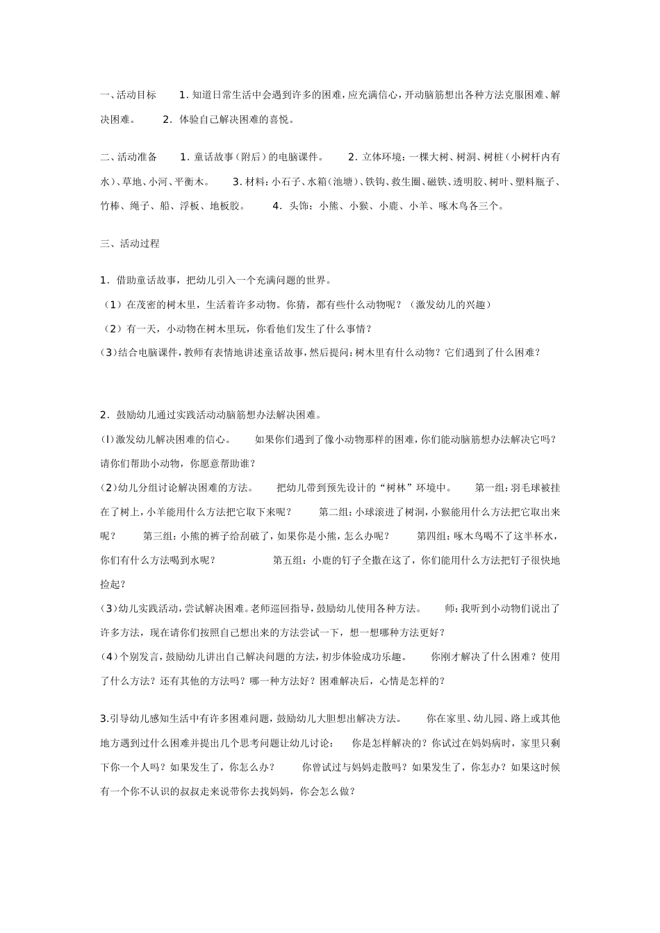 一、活动目标1.知道日常生活中会遇到许多的困难,应充满信心,开动脑筋想出各种方法克服困难、解决困难。2.体验自己解决困难的喜悦。二、活动准备1.童话故事(附后)的电脑课件。2.立体环境:一棵大树、树洞...