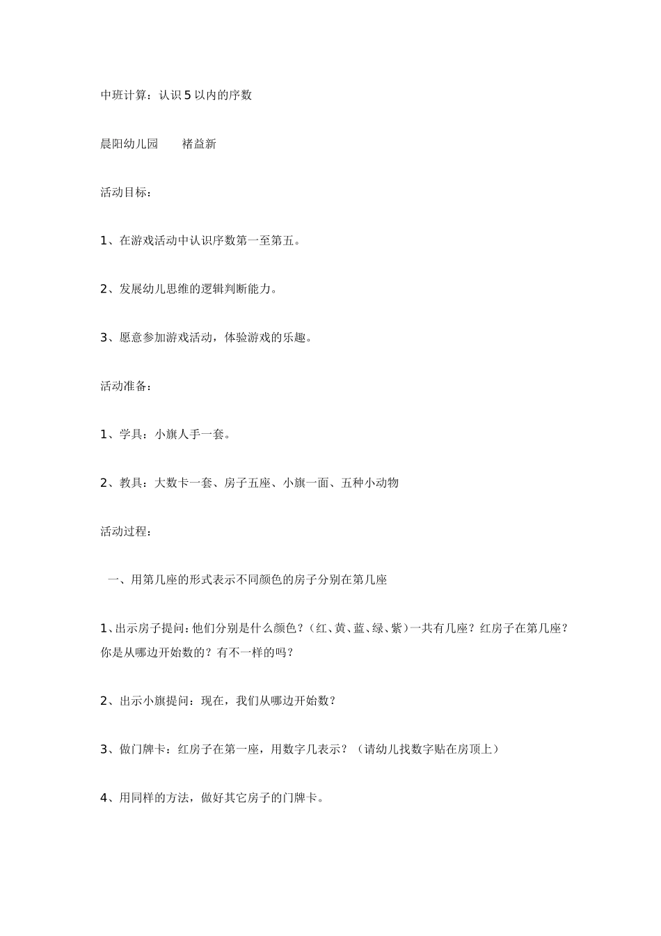 中班计算:认识5以内的序数晨阳幼儿园褚益新活动目标:1、在游戏活动中认识序数第一至第五。2、发展幼儿思维的逻辑判断能力。3、愿意参加游戏活动,体验游戏的乐趣。活动准备:1、学具:小旗人手一套。2、教具:...
