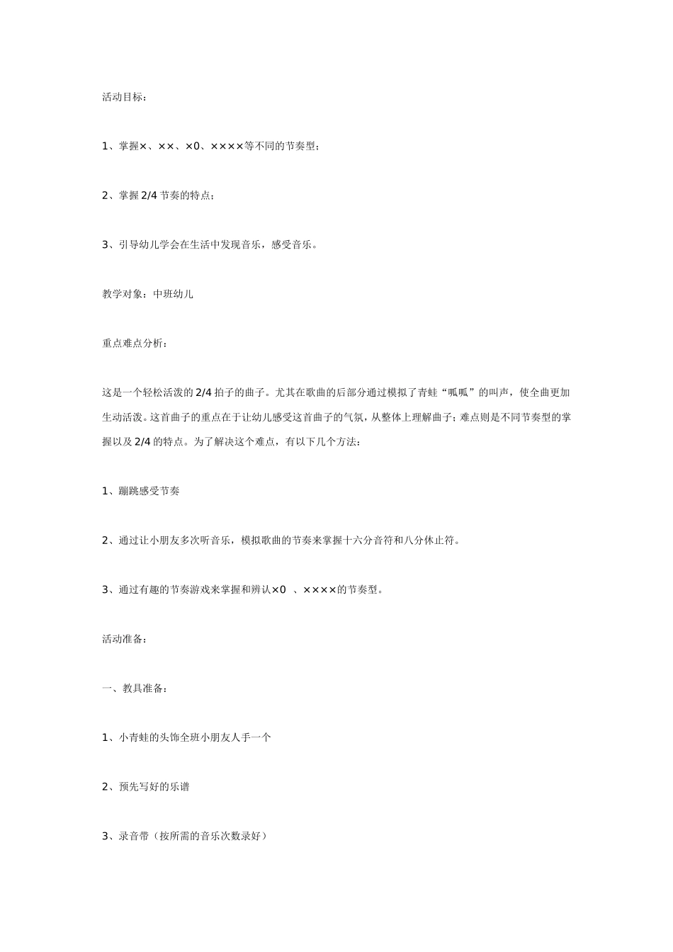 活动目标:1、掌握×、××、×0、××××等不同的节奏型;2、掌握2/4节奏的特点;3、引导幼儿学会在生活中发现音乐,感受音乐。教学对象:中班幼儿重点难点分析:这是一个轻松活泼的2/4拍子的曲子。尤其在歌曲...