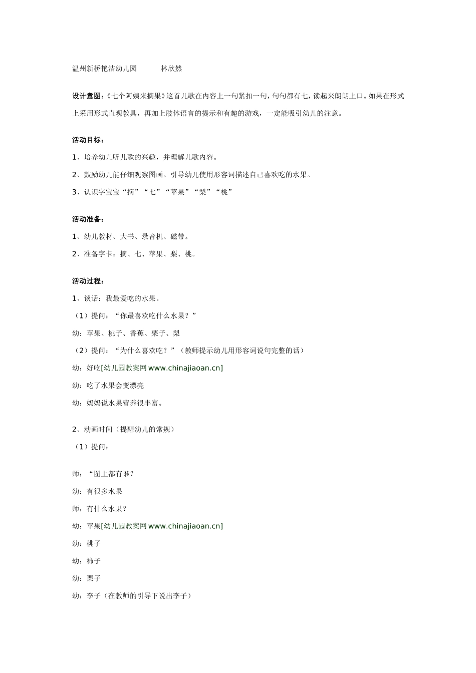 温州新桥艳洁幼儿园林欣然设计意图:《七个阿姨来摘果》这首儿歌在内容上一句紧扣一句,句句都有七,读起来朗朗上口。如果在形式上采用形式直观教具,再加上肢体语言的提示和有趣的游戏,一定能吸引幼儿的注意。...