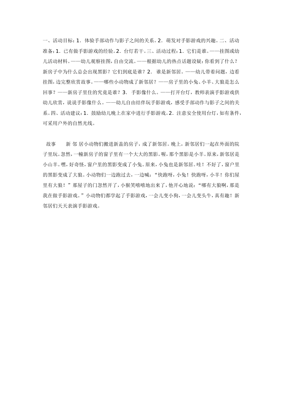 一、活动目标:1.体验手部动作与影子之间的关系。2.萌发对手影游戏的兴趣。二、活动准备:1.已有做手影游戏的经验。2.台灯若干。三、活动过程:1.它们是谁。——挂图或幼儿活动材料。——幼儿观察挂图,自由...