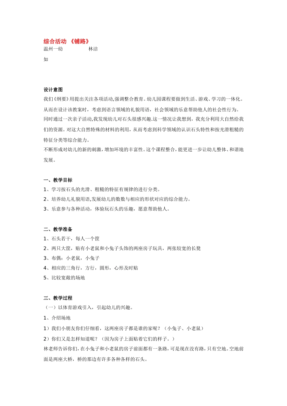 综合活动《铺路》温州一幼林洁如设计意图我们《纲要》用提出关注各项活动,强调整合教育。幼儿园课程要做到生活、游戏、学习的一体化。从而在设计该教案时,考虑到语言领域的礼貌用语,社会领域的乐意帮助他人的社...