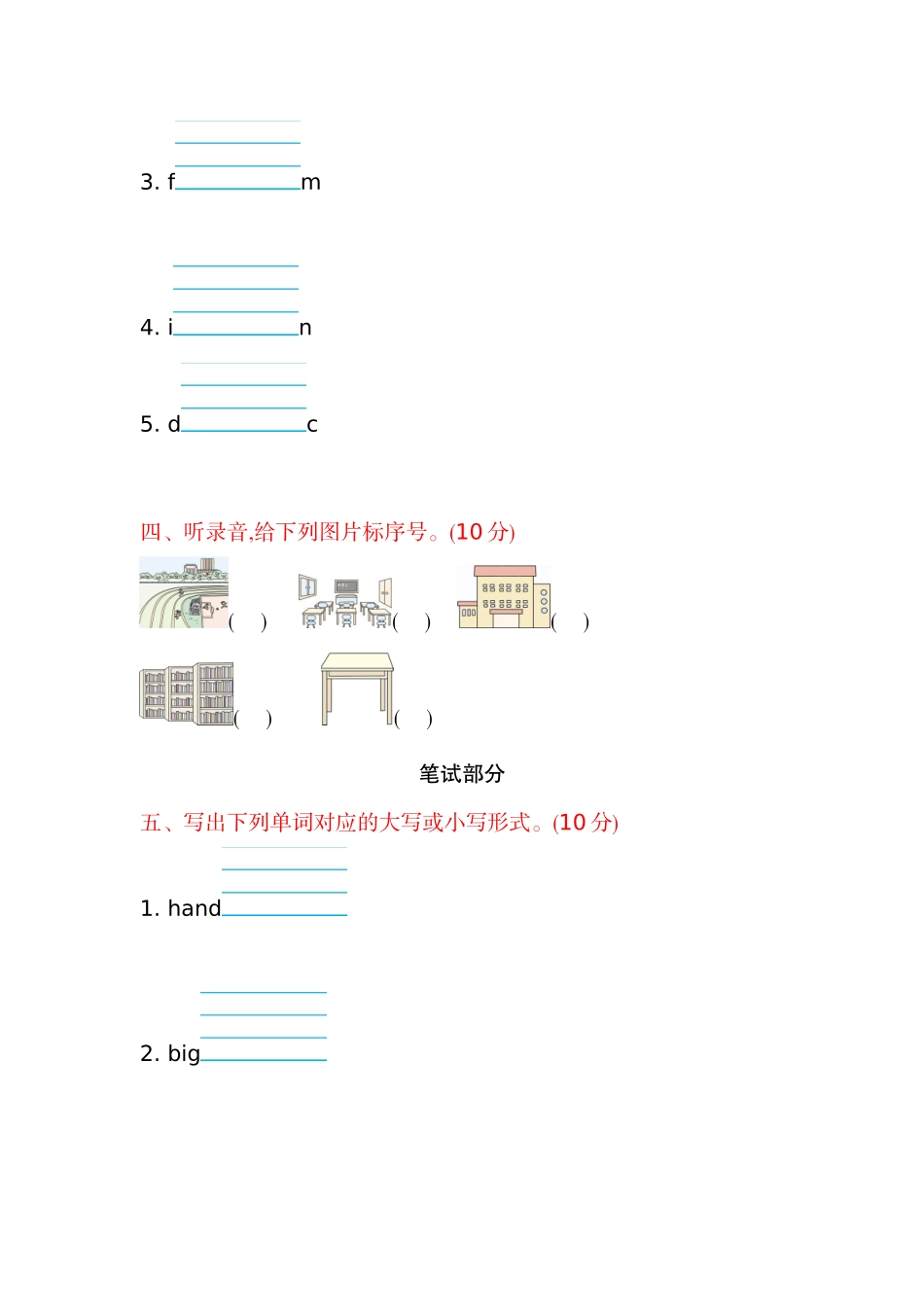 冀教版英语3年级上册unit2单元测试卷单元测试满分:100分时间:60分钟得分:听力部分一、听录音,根据听到的单词,圈出相应的大写字母。(10分)1.ACD2.EFH3.GIM4.NBJ5.HLB二、听录音,判断图片与所听内容是(T)否(F)相符...