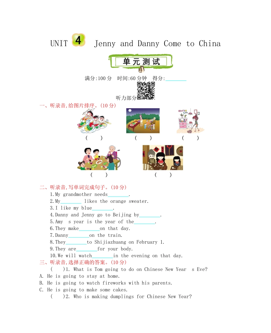 UNITJennyandDannyCometoChina满分:100分时间:60分钟得分:听力部分一、听录音,给图片排序。(10分)二、听录音,写单词完成句子。(10分)1.Mygrandmotherneeds.2.Mylikestheorangesweater.3.Ilikemyblue.4.DannyandJe...