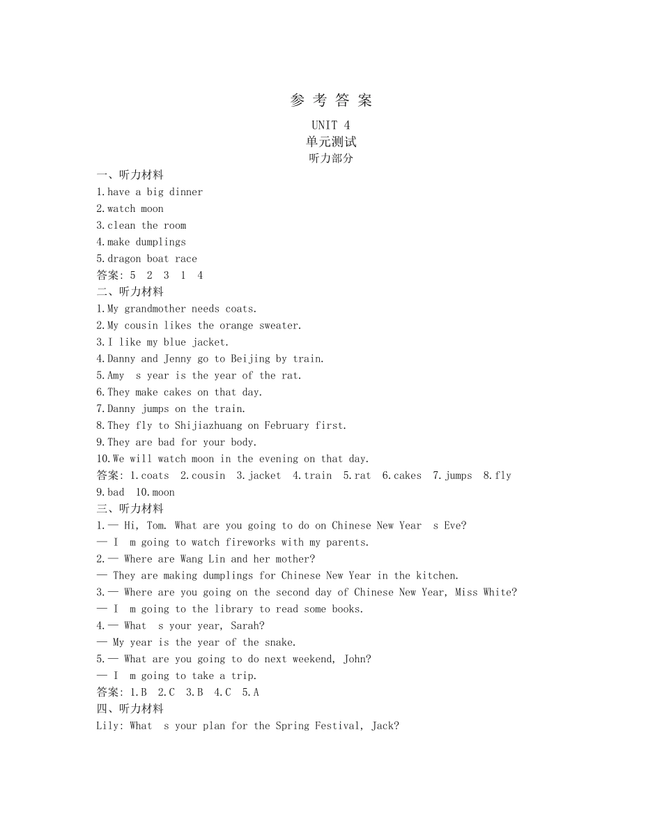 参考答案UNIT4单元测试听力部分一、听力材料1.haveabigdinner2.watchmoon3.cleantheroom4.makedumplings5.dragonboatrace答案:52314二、听力材料1.Mygrandmotherneedscoats.2.Mycousinlikestheorangesweater.3.Il...