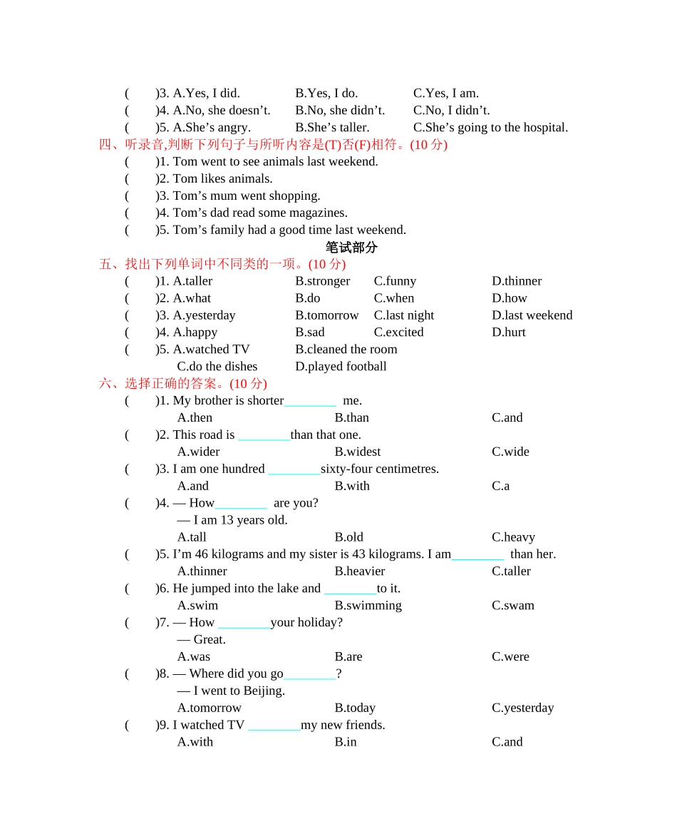 期中测试满分:100分时间:60分钟得分:听力部分一、听录音,选择与所听内容相符的图片。(10分)()1.A.B.()2.A.B.()3.A.B.()4.A.B.()5.A.B.二、听录音,判断对(􀳫)错(✕)。(10分)()1.YesterdaywasWednesday.()2.Mikerea...