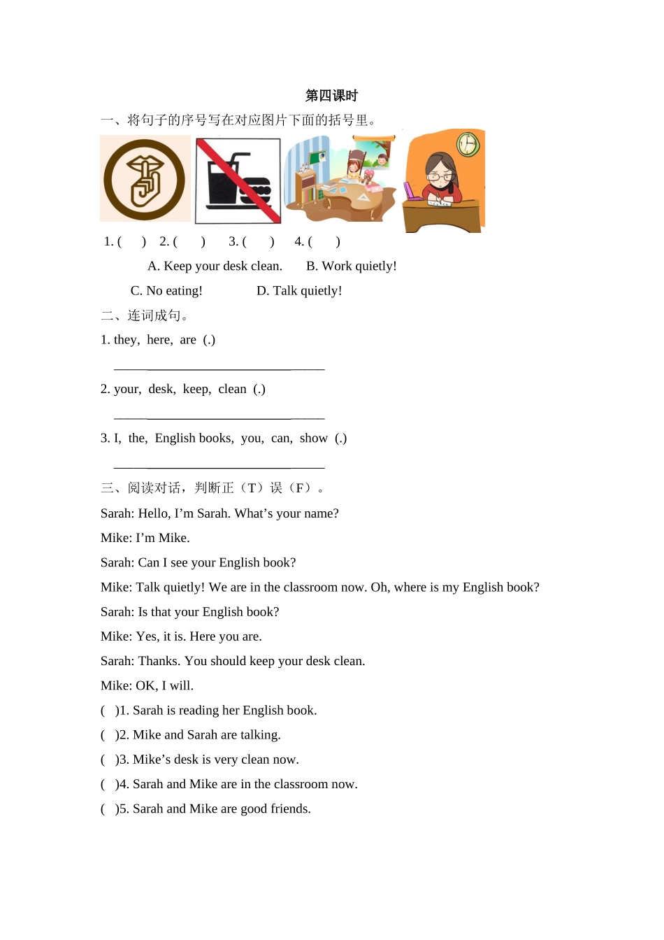 第四课时一、将句子的序号写在对应图片下面的括号里。1.()2.()3.()4.()A.Keepyourdeskclean.B.Workquietly!C.Noeating!D.Talkquietly!二、连词成句。1.they,here,are(.)__________2.your,desk,keep,clean(.)_____...
