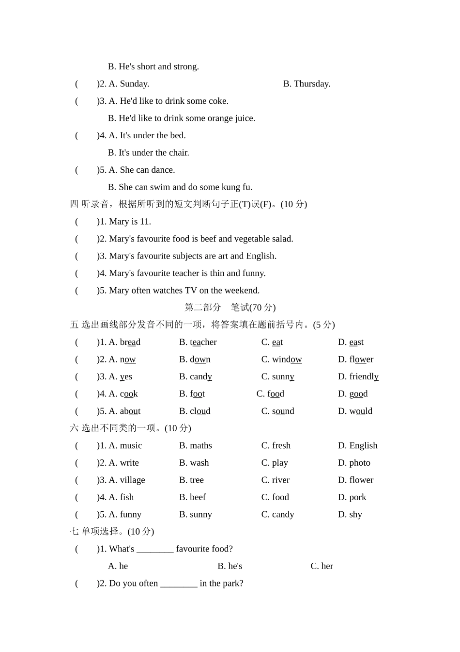 期末检测卷3时间:60分钟满分:100分听力(30分)笔试(70分)总分题号一二三四五六七八九十十一十二得分第一部分听力(30分)一听录音,判断下列图片与你所听到的内容是(T)否(F)相符。(5分)二听录音,选择与所听内容相...