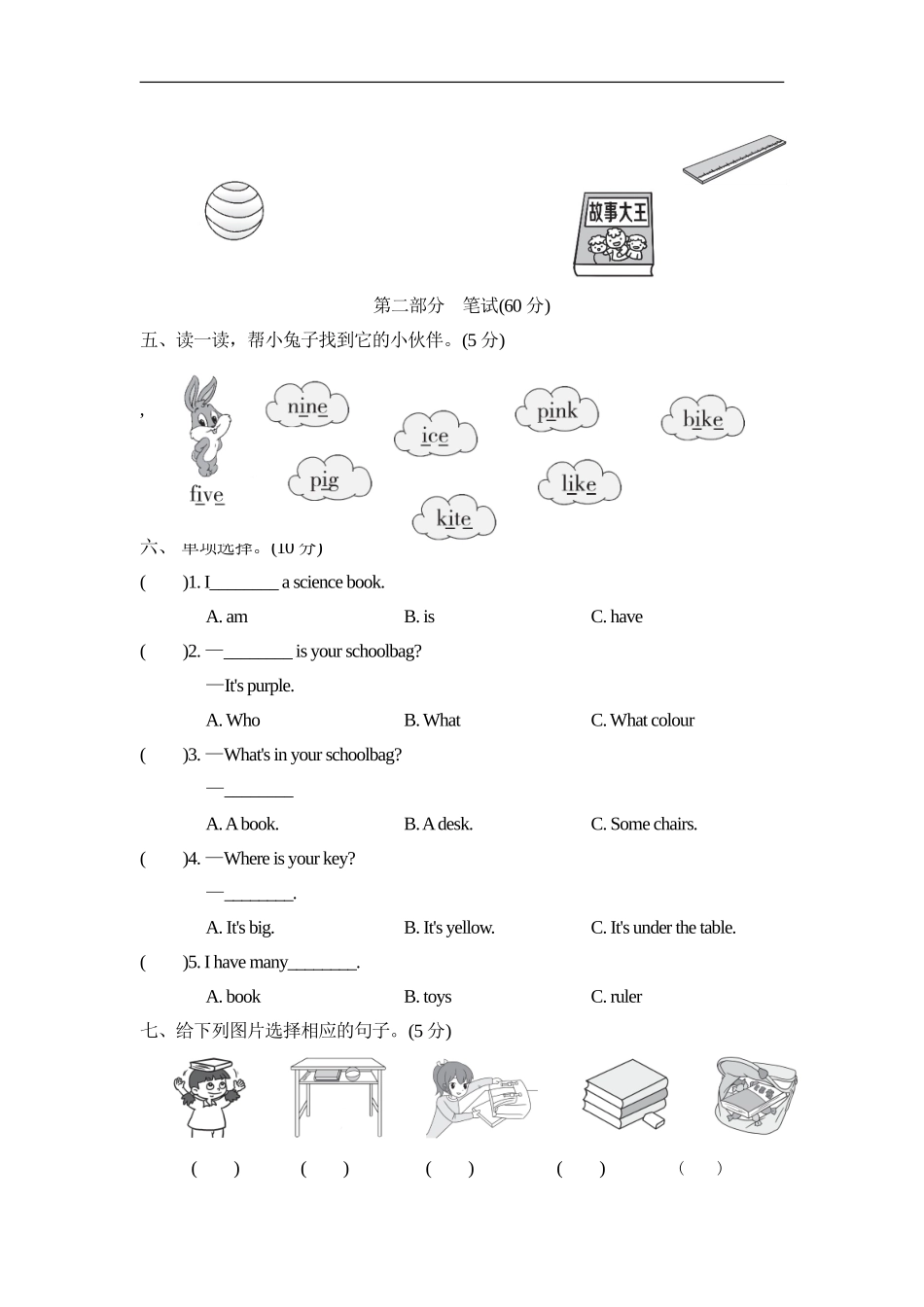 人教版英语四年级上册Unit2达标检测卷时间:40分钟满分:100分听力(40分)笔试(60分)总分题号一二三四五六七八九十十一得分第一部分听力(40分)一、听录音,圈出与录音内容相符的图片。(10分)1.A.B.2.A.B.3.A.B.4.A...