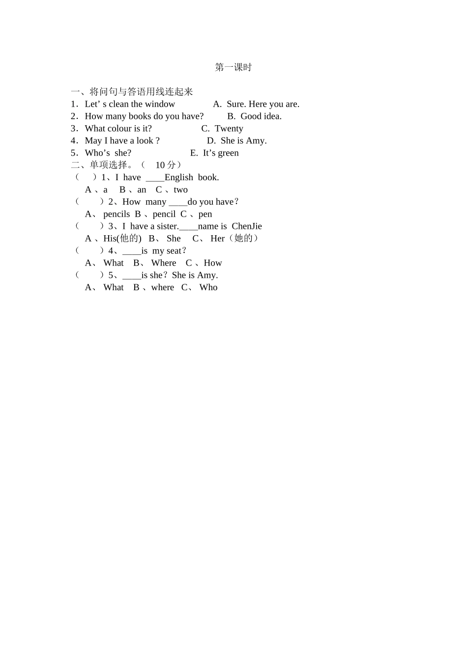 第一课时一、将问句与答语用线连起来1.Let’scleanthewindowA.Sure.Hereyouare.2.Howmanybooksdoyouhave?B.Goodidea.3.Whatcolourisit?C.Twenty4.MayIhavealook?D.SheisAmy.5.Who’sshe?E.It’sgreen二、单...