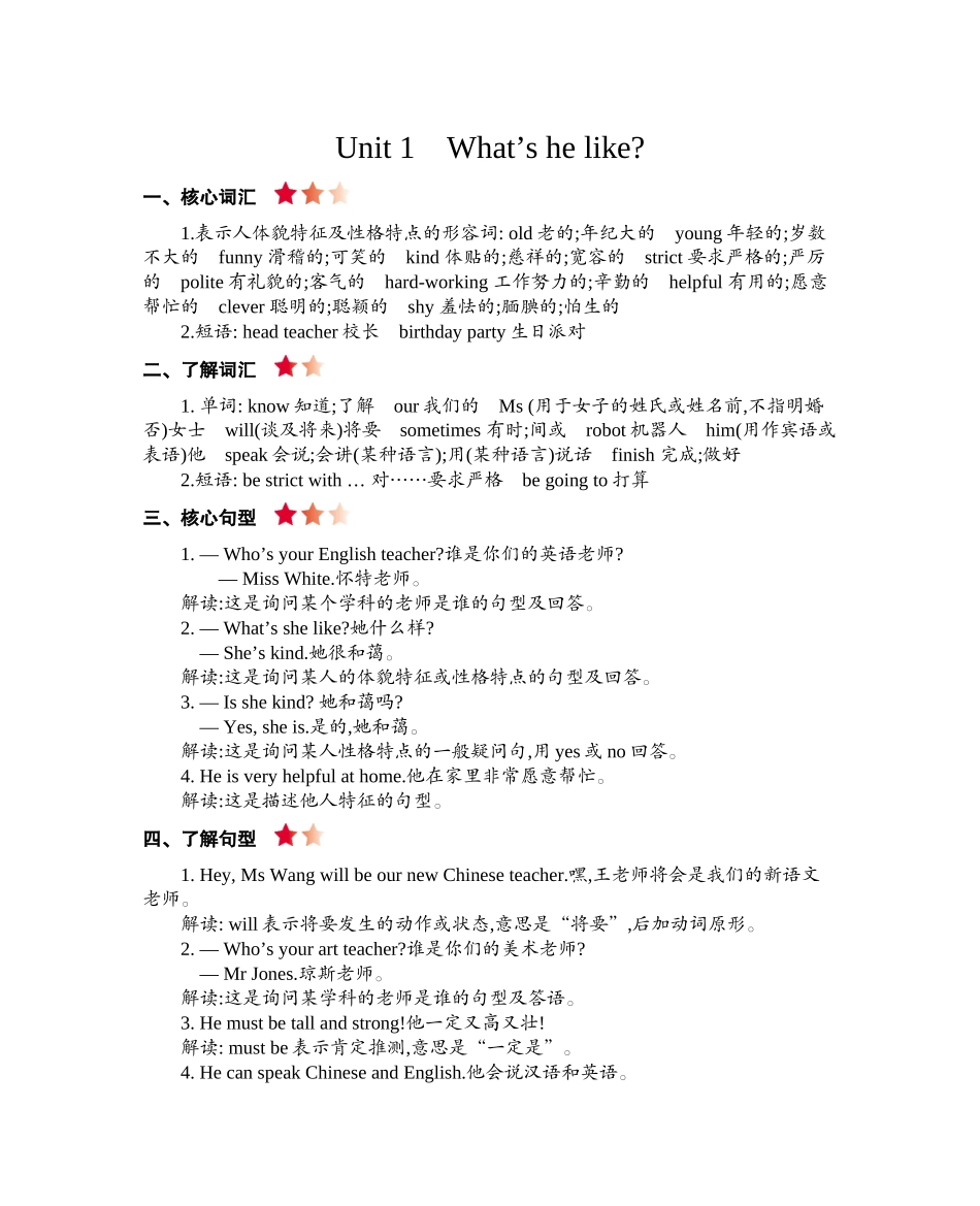 Unit1What’shelike?一、核心词汇1.表示人体貌特征及性格特点的形容词:old老的;年纪大的young年轻的;岁数不大的funny滑稽的;可笑的kind体贴的;慈祥的;宽容的strict要求严格的;严厉的polite有礼貌的;客气的hard-wo...