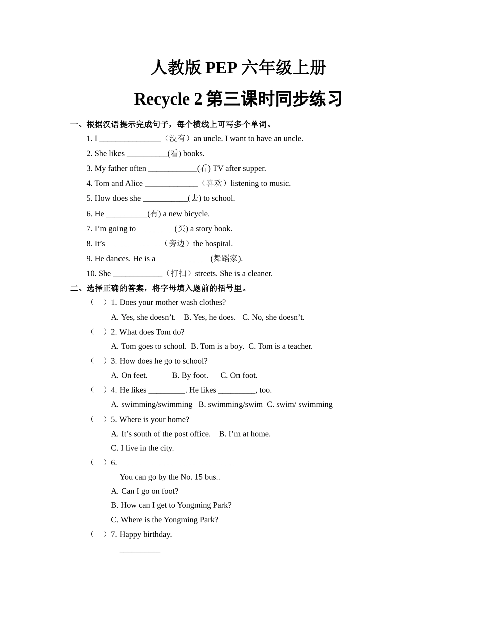 人教版PEP六年级上册Recycle2第三课时同步练习一、根据汉语提示完成句子,每个横线上可写多个单词。1.I_______________(没有)anuncle.Iwanttohaveanuncle.2.Shelikes__________(看)books.3.Myfatheroften______...