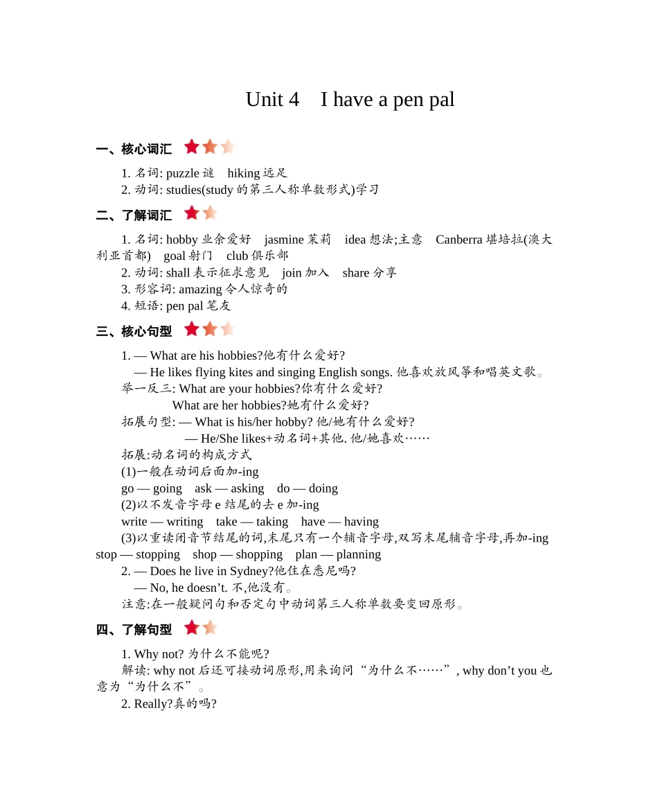 Unit4Ihaveapenpal一、核心词汇1.名词:puzzle谜hiking远足2.动词:studies(study的第三人称单数形式)学习二、了解词汇1.名词:hobby业余爱好jasmine茉莉idea想法;主意Canberra堪培拉(澳大利亚首都)goal射门club俱乐...