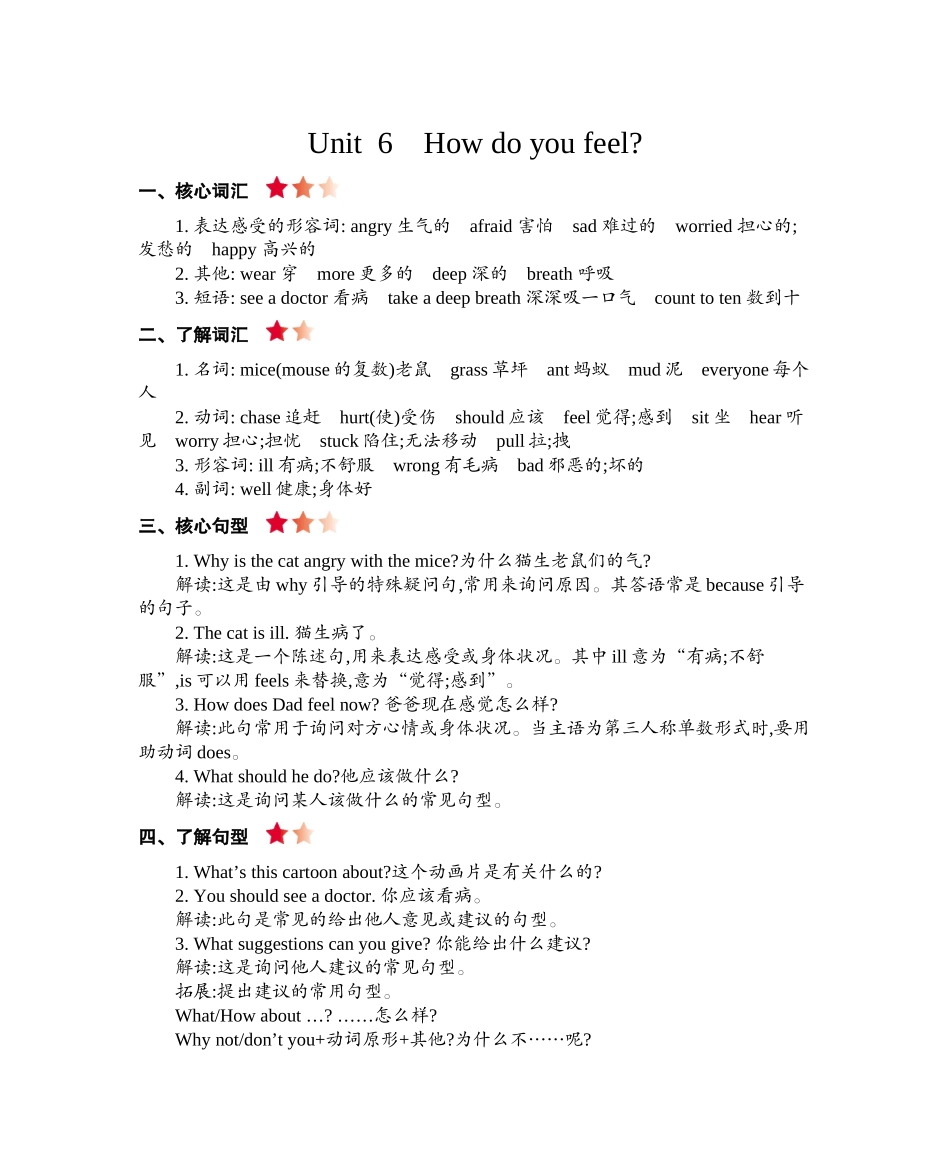 Unit6Howdoyoufeel?一、核心词汇1.表达感受的形容词:angry生气的afraid害怕sad难过的worried担心的;发愁的happy高兴的2.其他:wear穿more更多的deep深的breath呼吸3.短语:seeadoctor看病takeadeepbreath深深吸一口...