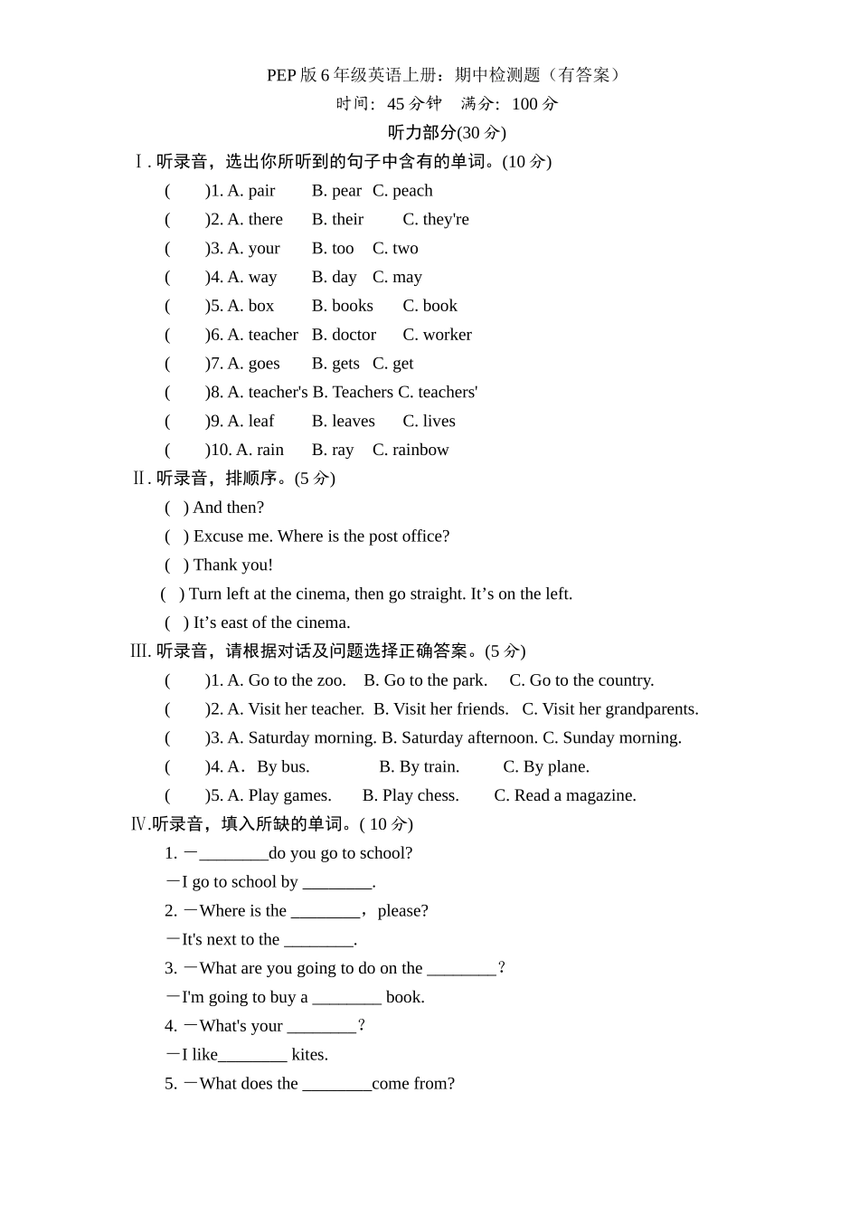 PEP版6年级英语上册:期中检测题(有答案)时间:45分钟满分:100分听力部分(30分)Ⅰ.听录音,选出你所听到的句子中含有的单词。(10分)()1.A.pairB.pearC.peach()2.A.thereB.theirC.they're()3.A.yourB.tooC.two(...