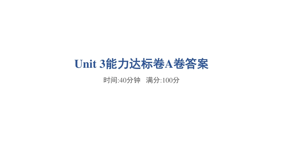 Unit3能力达标卷A卷答案时间:40分钟满分:100分()1.A.clothesB.colourC.colourful()2.A.readB.redC.ruler()3.A.canB.forC.fun()4.A.wantB.whatC.write()5.A.blueB.bookC.blackBBAAC一、听句子,选出你所听到的单词...