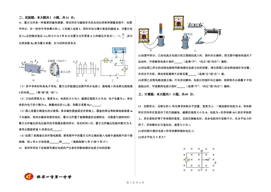 2024-2025学年度张家口市第一中学高三年级高考第一次模拟物理试题.pdf_第3页