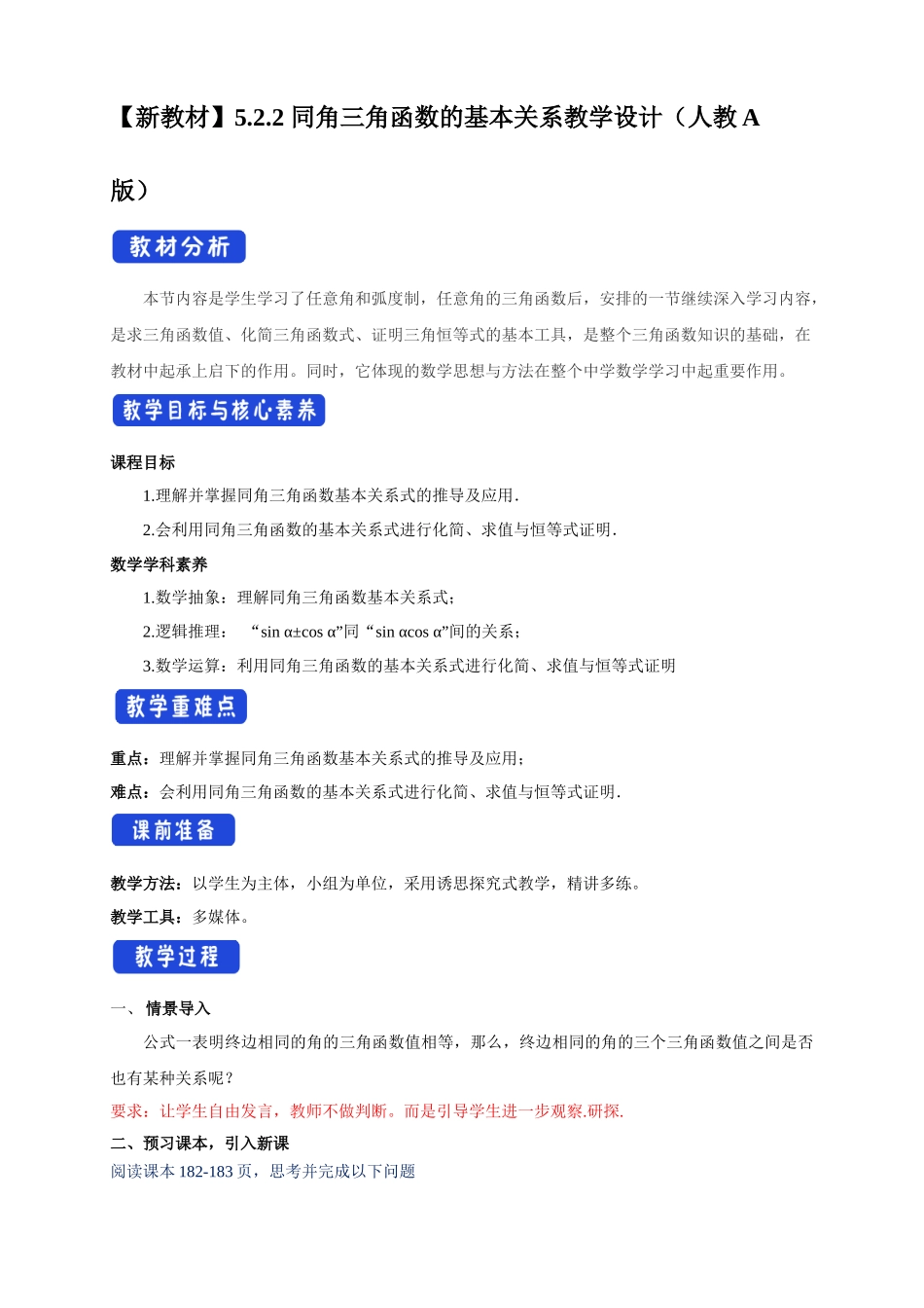 新人教版高中数学必修第一册全套教案含情景引入核心素养word版_5.2.2 同角三角函数的基本关系(2).docx