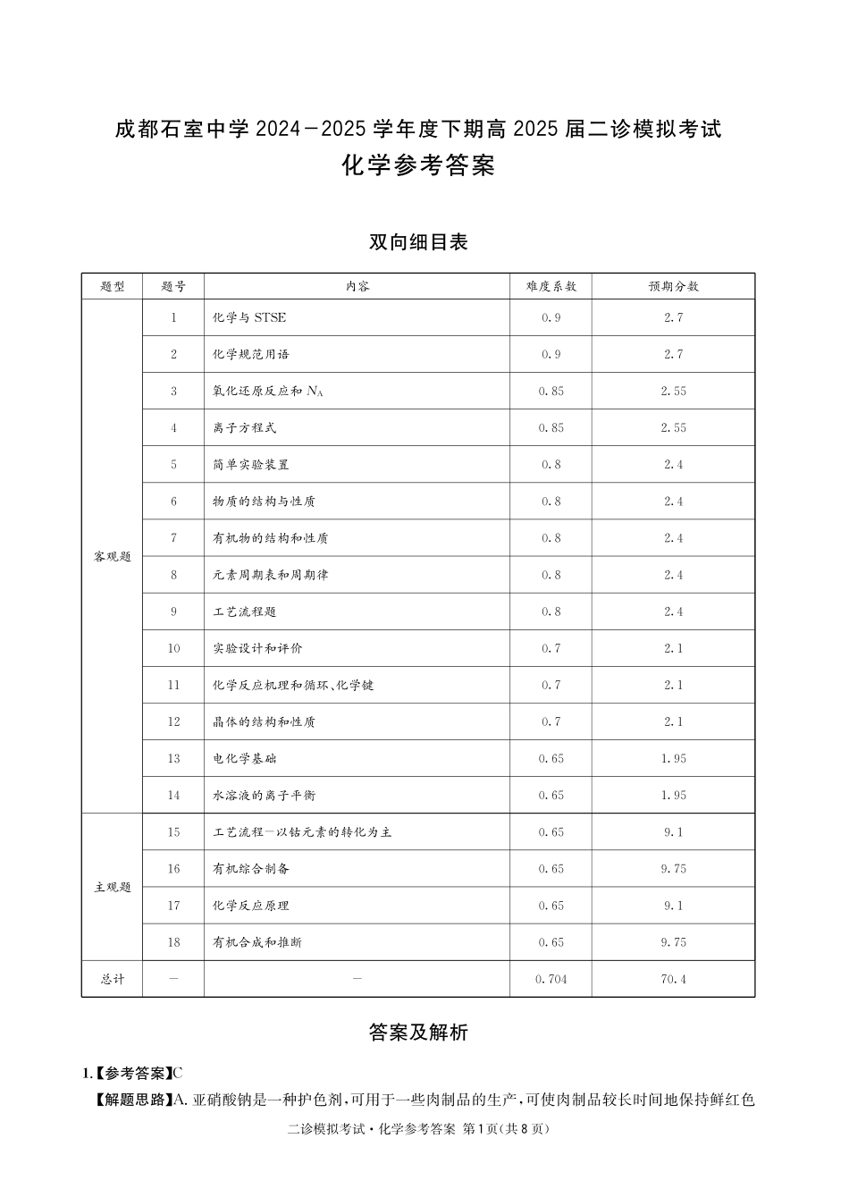 成都石室中学2024-2025学年度下期高2025届二诊模拟考试 化学答案.pdf_第1页