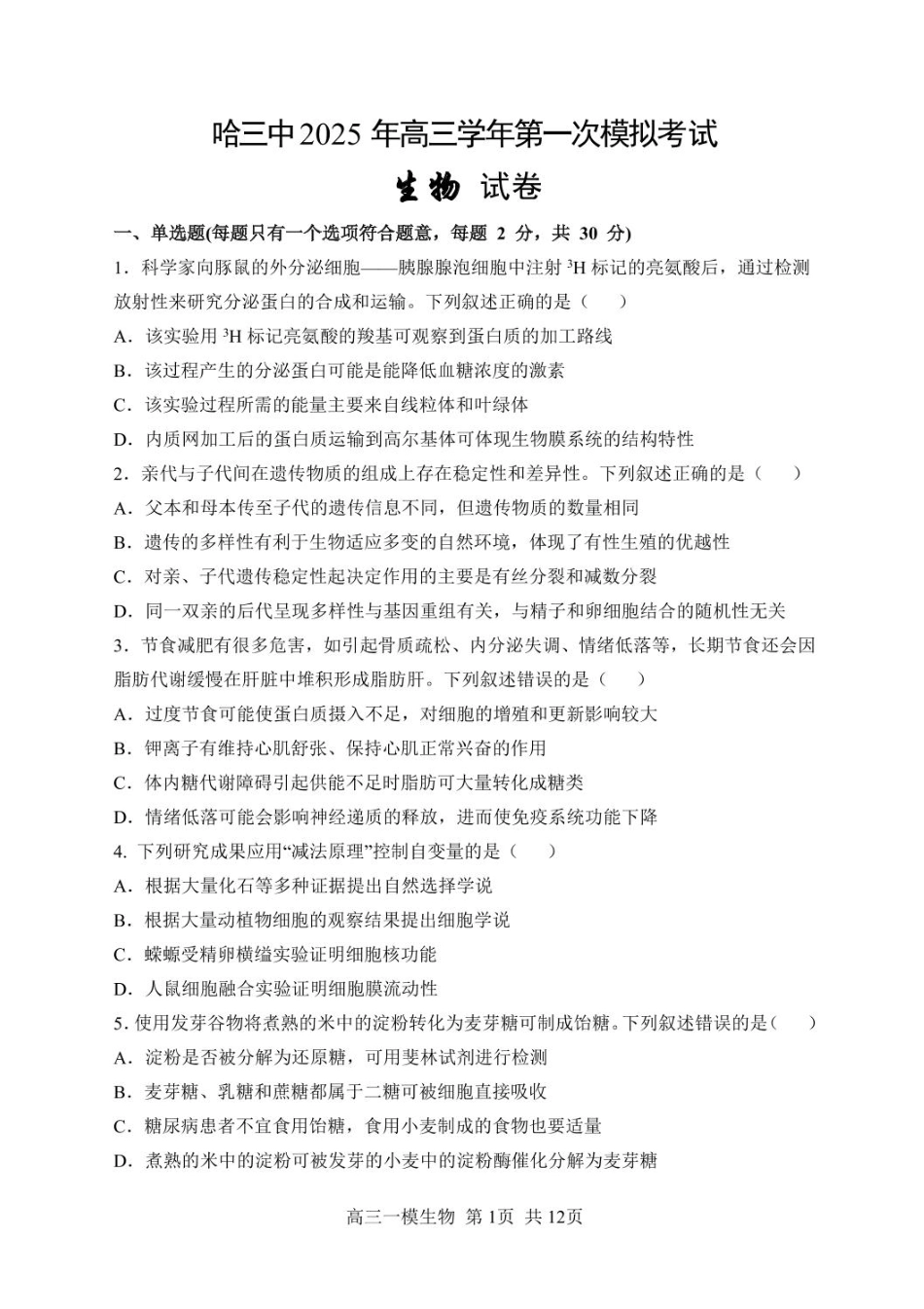 哈三中2025年高三学年第一次模拟考试生物试题+答案.pdf_第1页