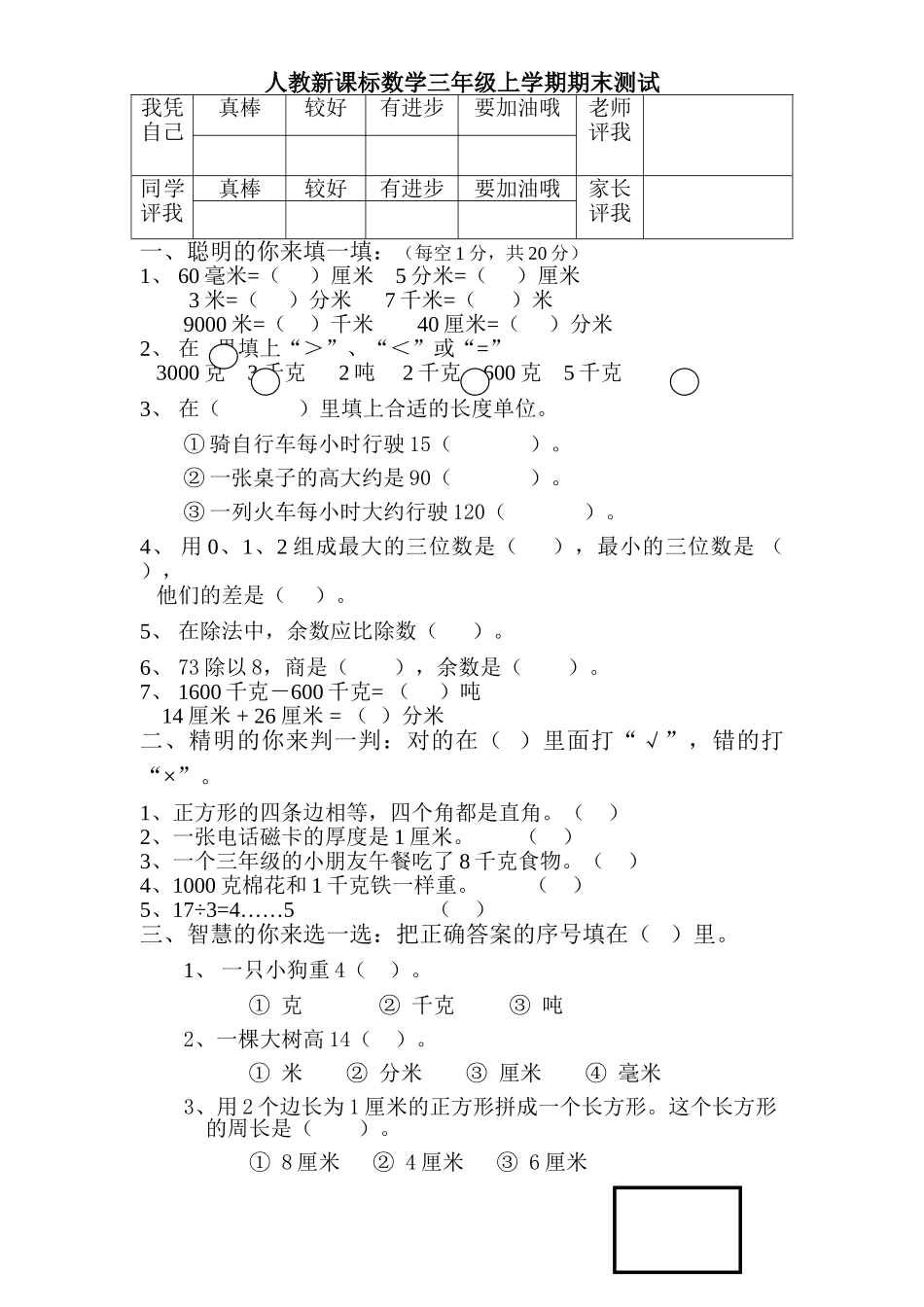 人教新课标数学三年级上学期期末测试我凭自己真棒较好有进步要加油哦老师评我同学评我真棒较好有进步要加油哦家长评我一、聪明的你来填一填:(每空1分,共20分)1、60毫米=()厘米5分米=()厘米3米=()分米7...