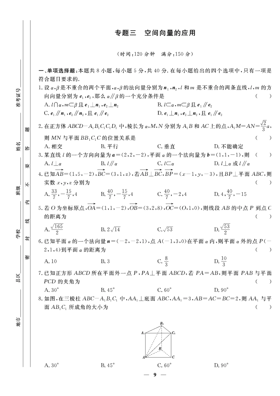 第一章专题三 空间向量的应用_高中同步练测卷数学选择性必修第一册人教A版.pdf_第1页