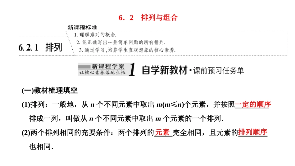 6.2排列与组合(一)教材梳理填空(1)排列:一般地,从n个不同元素中取出m(m≤n)个元素,并按照排成一列,叫做从n个不同元素中取出m个元素的一个排列.(2)两个排列相同的充要条件:两个排列的完全相同,且元素的也...