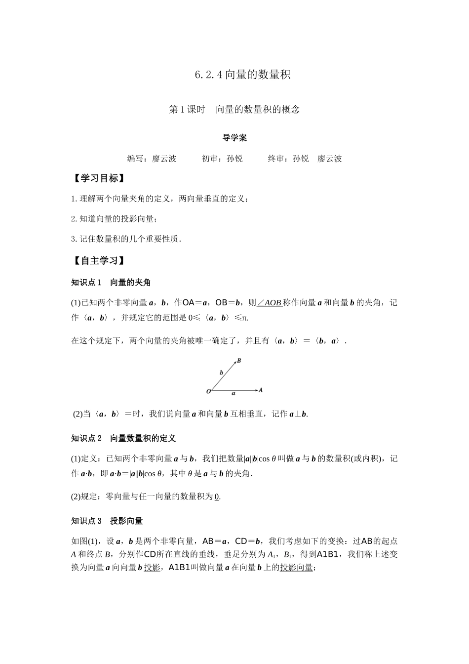 6.2.4向量的数量积第1课时向量的数量积的概念导学案编写:廖云波初审:孙锐终审:孙锐廖云波【学习目标】1.理解两个向量夹角的定义,两向量垂直的定义;2.知道向量的投影向量;3.记住数量积的几个重要性质.【自...