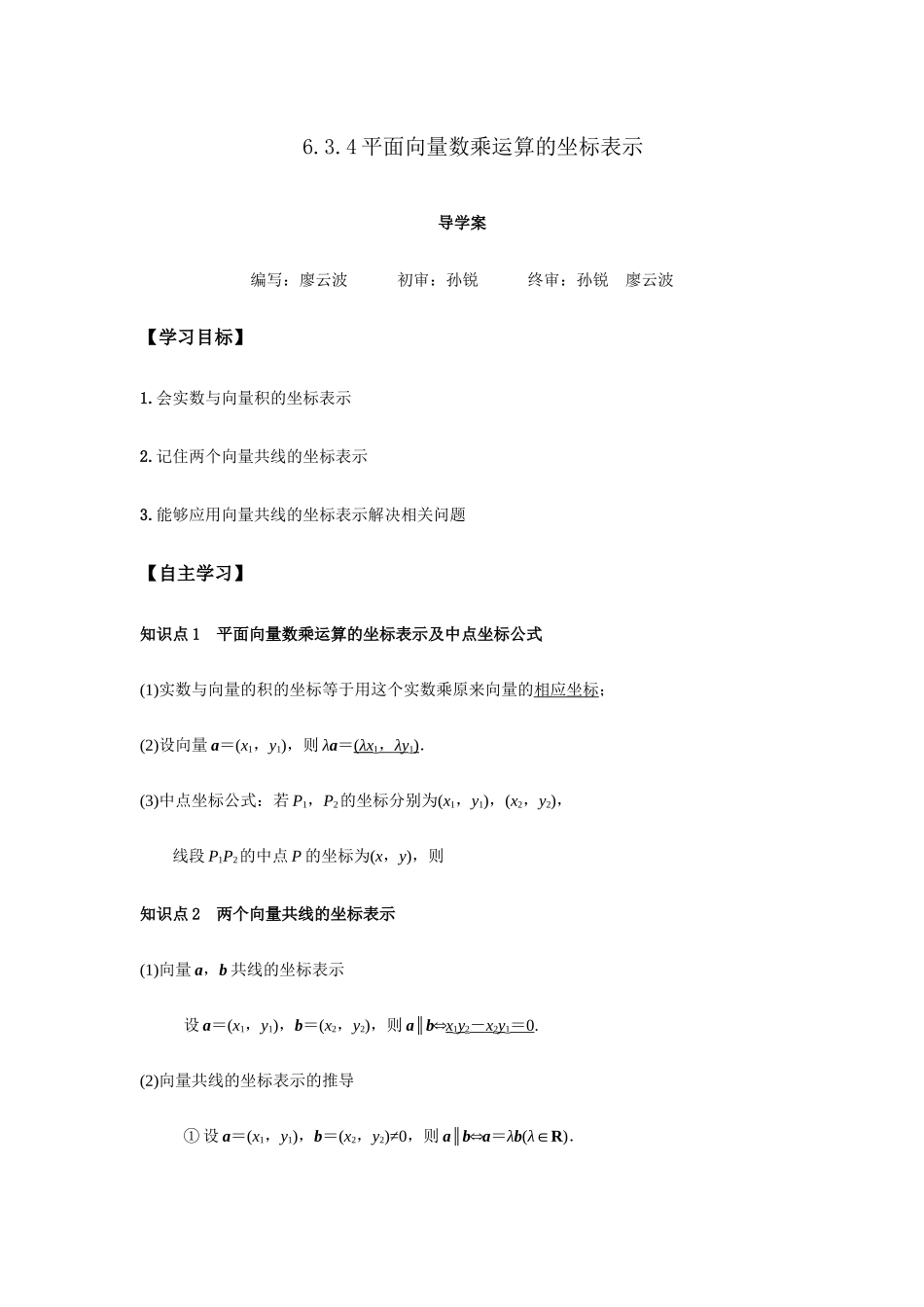 6.3.4平面向量数乘运算的坐标表示导学案编写:廖云波初审:孙锐终审:孙锐廖云波【学习目标】1.会实数与向量积的坐标表示2.记住两个向量共线的坐标表示3.能够应用向量共线的坐标表示解决相关问题【自主学习】知识...