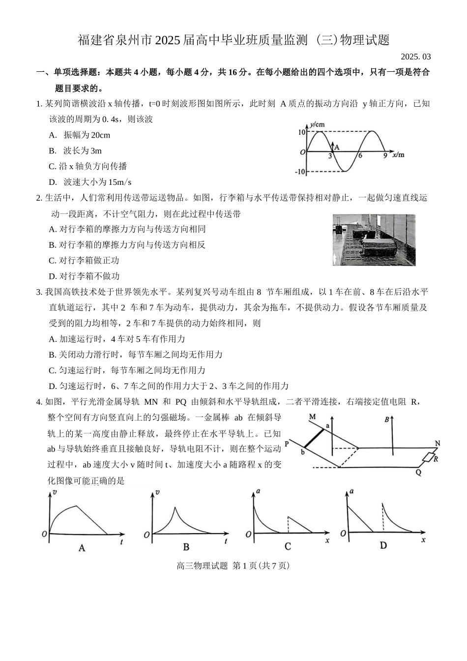 福建省泉州市2025届高中毕业班质量监测(三)物理试题2025.03一、单项选择题:本题共4小题,每小题4分,共16分。在每小题给出的四个选项中,只有一项是符合题目要求的。1.某列简谐横波沿x轴传播,t=0时刻波形图如图...