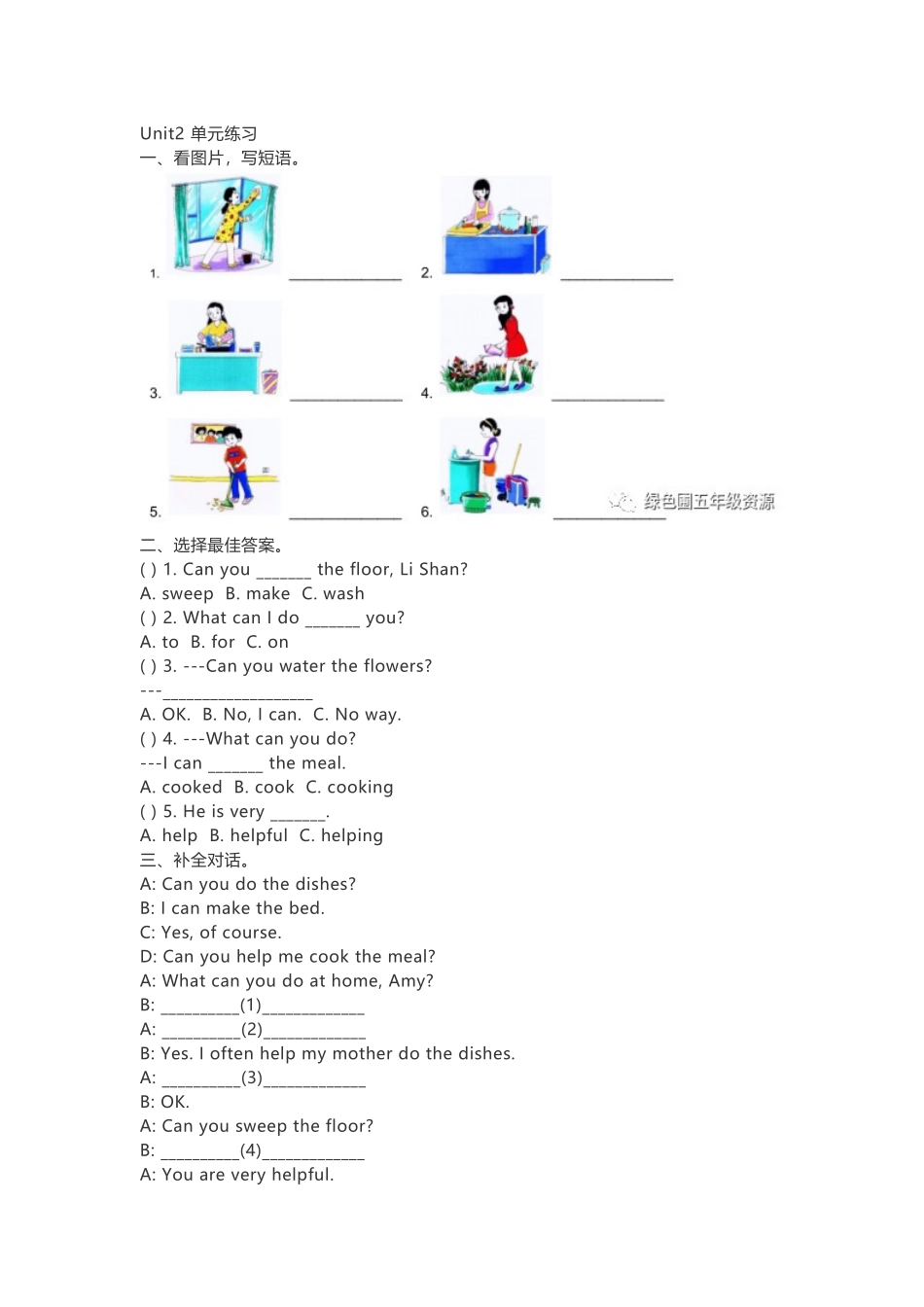 Unit2单元练习一、看图片,写短语。二、选择最佳答案。()1.Canyou_______thefloor,LiShan?A.sweepB.makeC.wash()2.WhatcanIdo_______you?A.toB.forC.on()3.---Canyouwatertheflowers?---___________________A.OK....