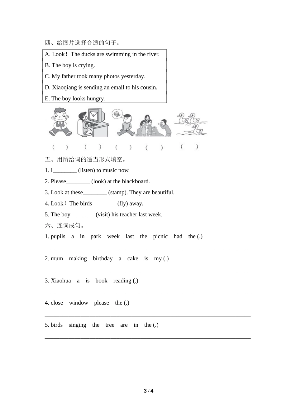 1/4Unit1Thesunisshining.一、找出不同类的单词。()1.A.interestingB.hungryC.picnic()2.A.writeB.photoC.send()3.A.sunB.treeC.sing()4.A.eatB.inC.on()5.A.sendingB.lookingC.shine二、单项选择。()1.Look_____...