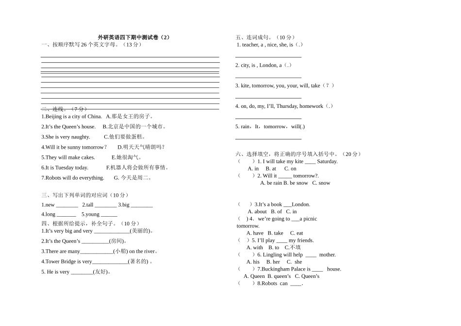 外研英语四下期中测试卷(2)一、按顺序默写26个英文字母。(13分)二、连线。(7分)1.BeijingisacityofChina.A.那是女王的房子。2.It’stheQueen’shouse.B.北京是中国的一个城市。3.Sheisverynaughty.C.他们要...