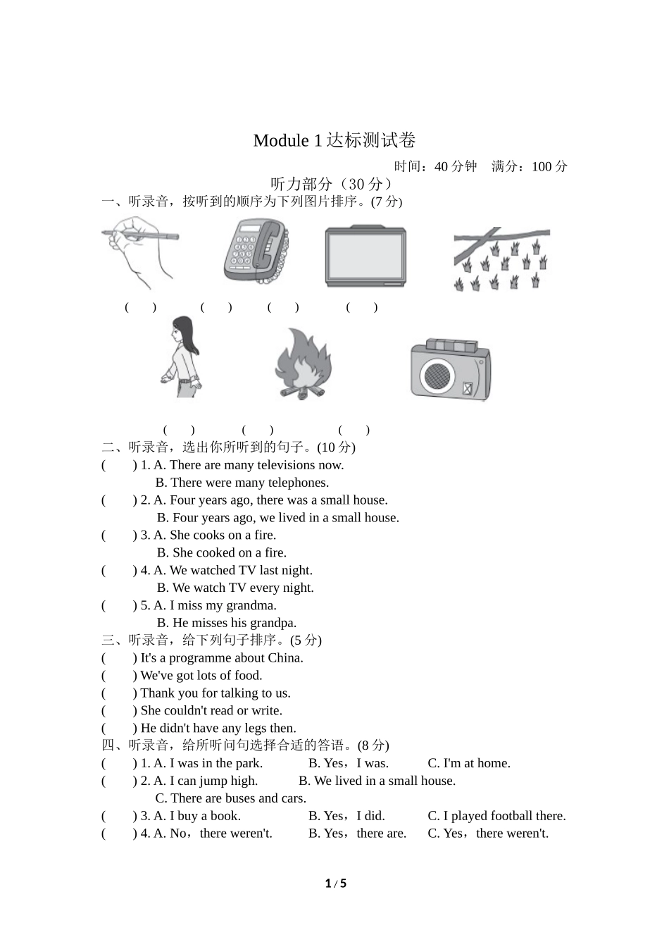 Module1达标测试卷时间:40分钟满分:100分听力部分(30分)一、听录音,按听到的顺序为下列图片排序。(7分)()()()()()()()二、听录音,选出你所听到的句子。(10分)()1.A.Therearemanytelevisionsnow.B.Therewere...