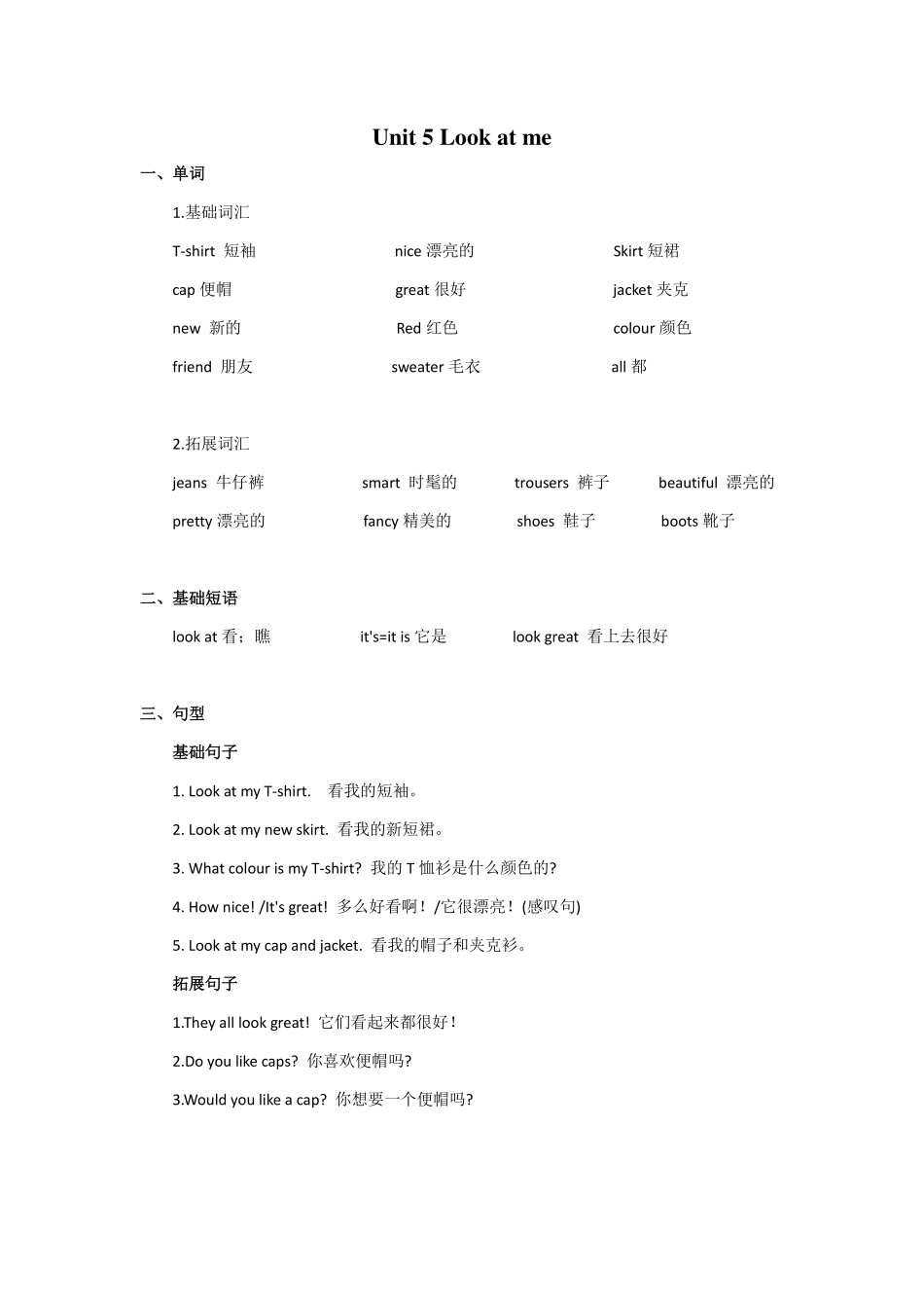 Unit5Lookatme一、单词1.基础词汇T-shirt短袖nice漂亮的Skirt短裙cap便帽great很好jacket夹克new新的Red红色colour颜色friend朋友sweater毛衣all都2.拓展词汇jeans牛仔裤smart时髦的trousers裤子beautiful漂亮的p...