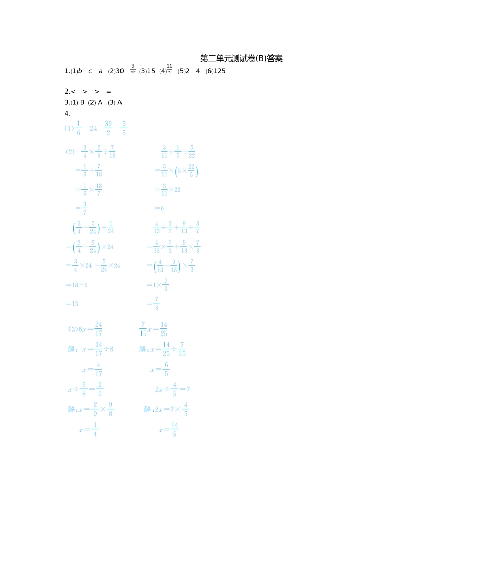 第二单元测试卷(B)1、填空。2、在○里填上“>”“<”或“=”。3、选择。(将正确答案的序号填在括号里)(1)下面的算式中结果最大的是()。(2)加工一批零件,第一车间单独做需11小时,如果第一车间加工这批零件的一半,...