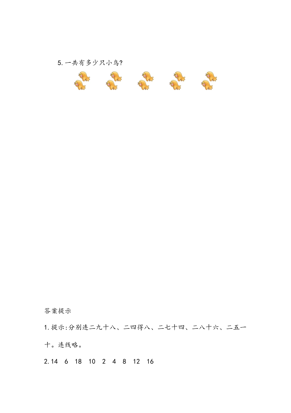 2.2.2练习三1.连一连。2.龟兔赛跑。3.算一算,填一填。车子辆数123456车轮个数24.兔妈妈一共买了多少个?5.一共有多少只小鸟?答案提示1.提示:分别连二九十八、二四得八、二七十四、二八十六、二五一十。连线略。2.1...